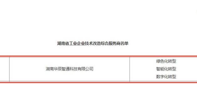 近日,湖南省工業和信息化廳正式公布湖南省工業企業技術改造綜合服務商入選名單,湖南華辰智通科技有限公司成功入選“綠色化轉型”、“智能化轉型”、“數字化轉型”三大類別服務商。